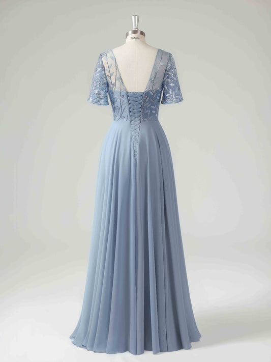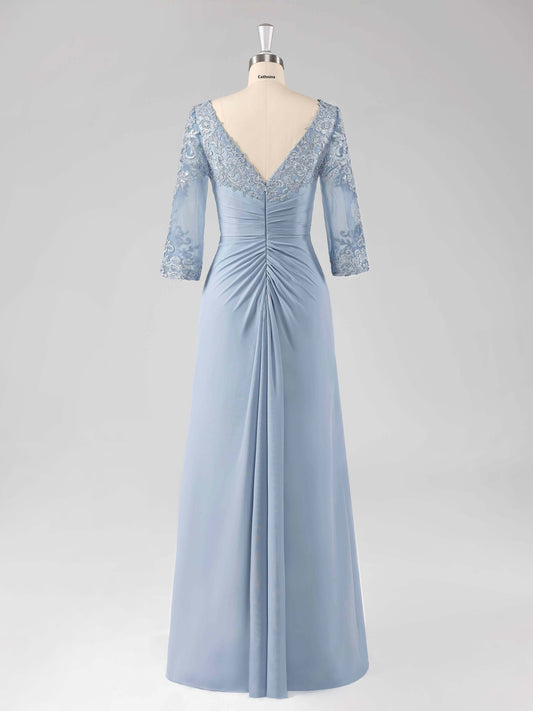 Mioni Elegant V-neck Lace Appliqued Chiffon Mother of the Bride Dresses
