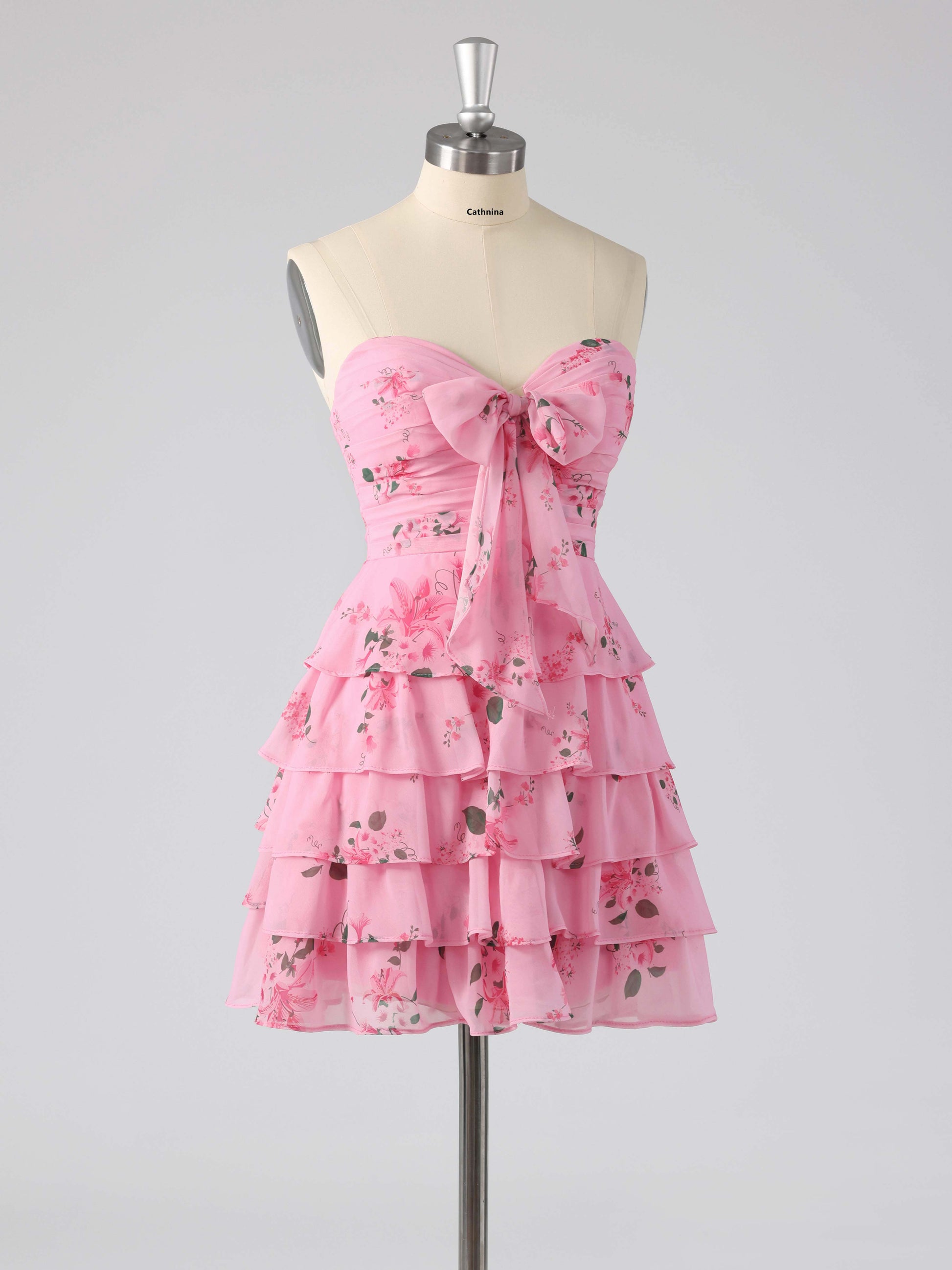 Denor Sweetheart Tiered Floral Print Short Homecoming Dress with Bow